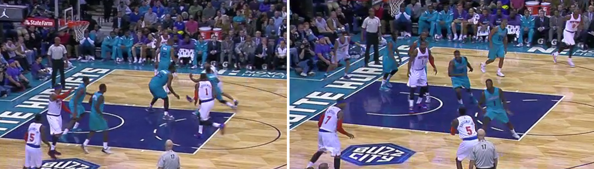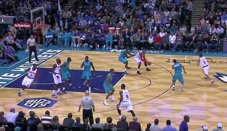 On this one, Kemba enters the ball Jefferson in the post, where he then holds the ball 4 seconds. He kicks it back out to Kemba, re-posts, gets the second entry pass, feels the double team coming, and kicks it out to Kemba again. Good so far. Wide open, Kemba hesitates, allowing the defense to recover, and throws up a contested 3. Short. Either shoot it our kick it, don’t hesitate and let the defense recover. This is one of the more frustrating possessions for me. Holding the ball, hesitating, stuck on one side of the floor…