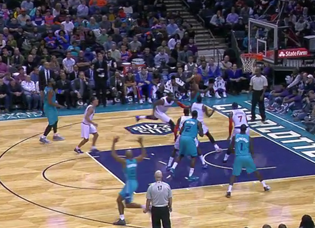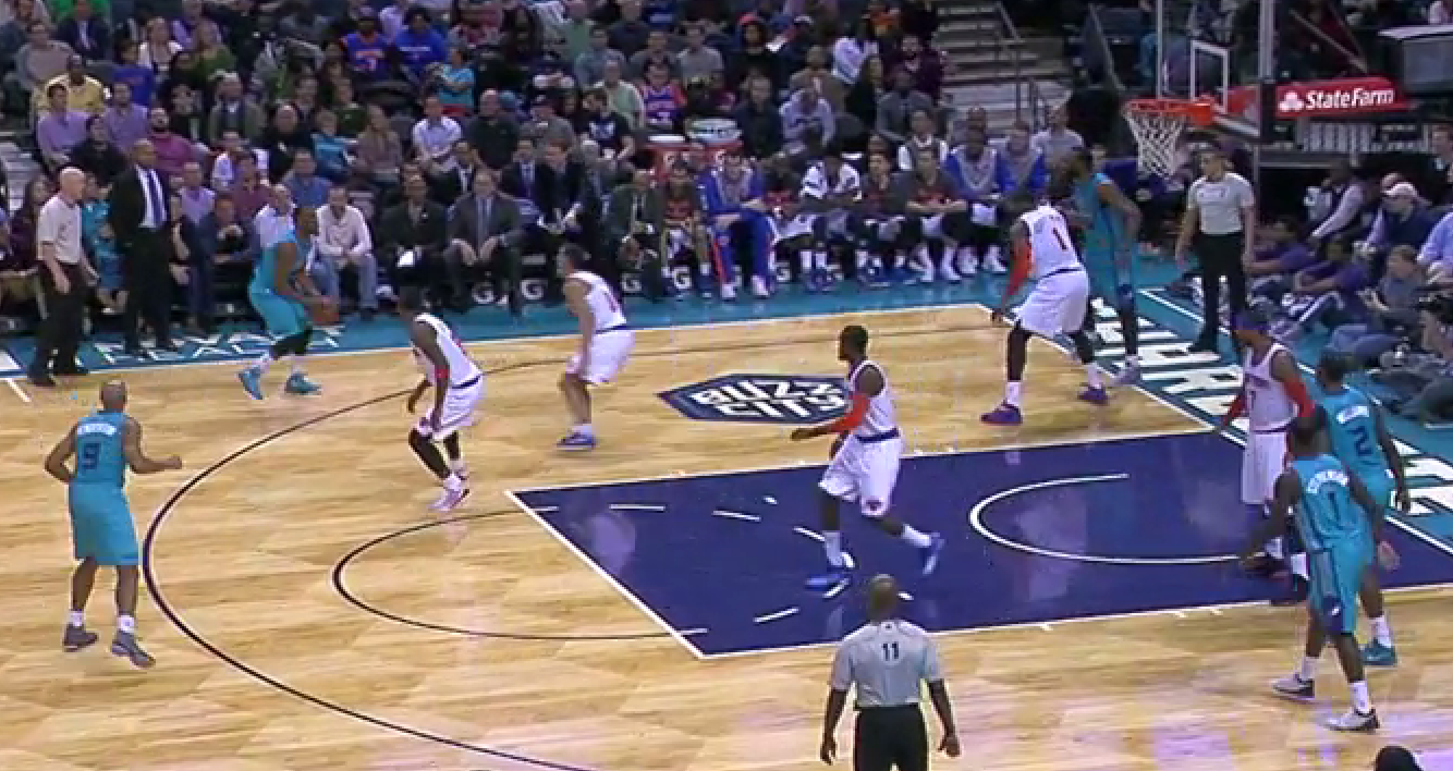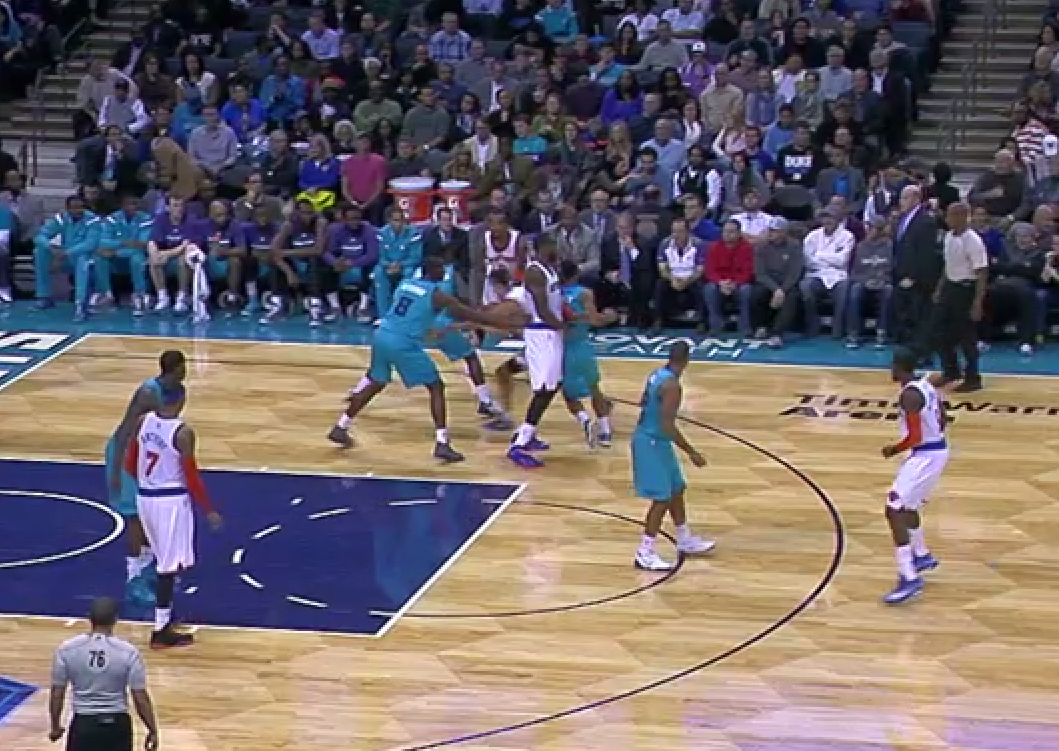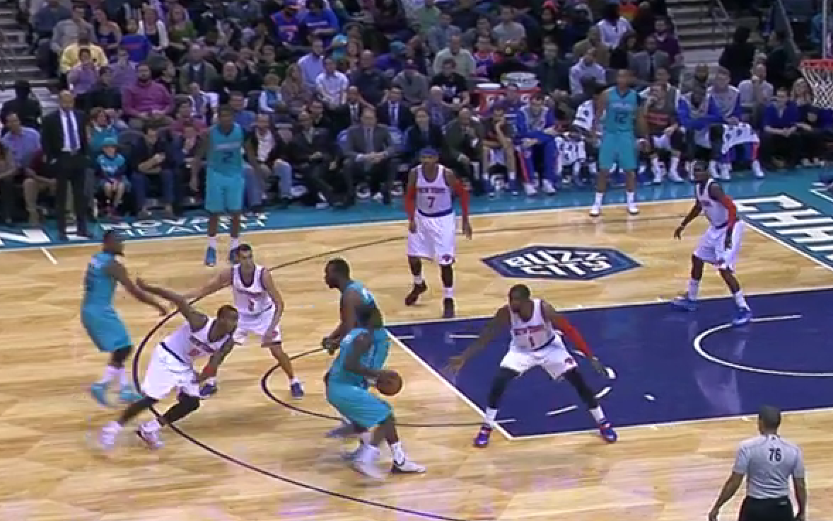 I would argue this is where the team started to tighten up. Kemba dribbles up the court, turns down a Jefferson pick, and takes an extremely difficult floater with 4 defenders around him and 13 seconds on the shot clock. You have to find a good shot here. This one was little more than a prayer. The spacing isn’t great, but Kemba’s not really helping things by short circuiting the play so quickly. Up until this play and the foul right before it that cut the lead from 10 to 8, Charlotte was withstanding a run of 3’s and tough shots and keeping the Knicks at arm’s distance. With 2 free throws and a really difficult, contested mid-range jumper from Melo, it’s a 6 point game with 2:49 left and the Hornets have put themselves in a position they didn’t need to be.