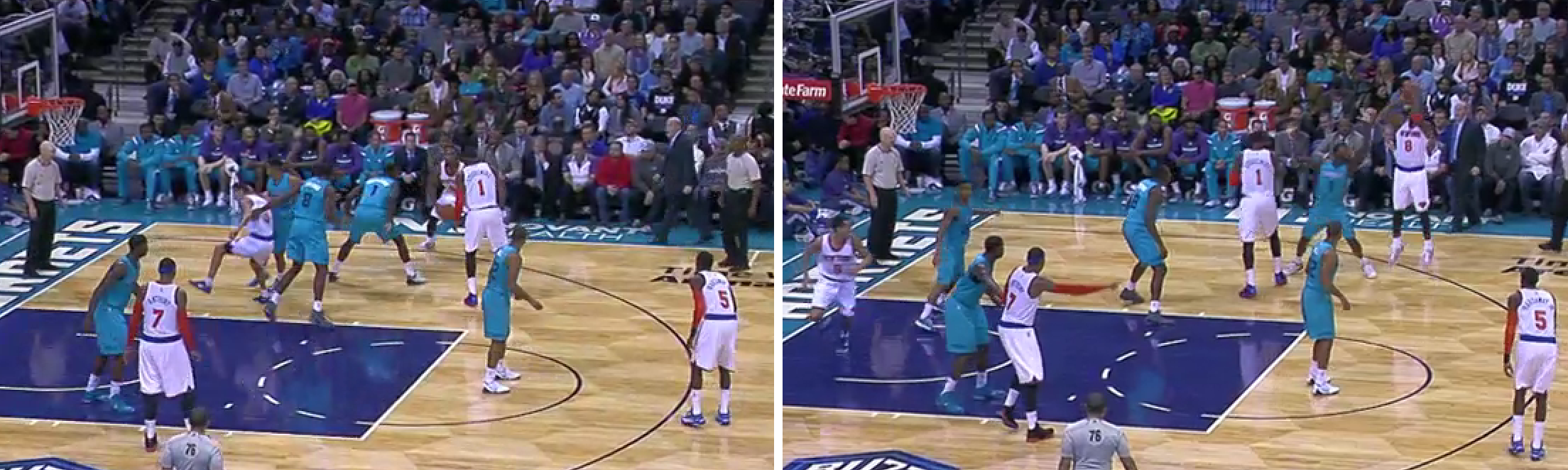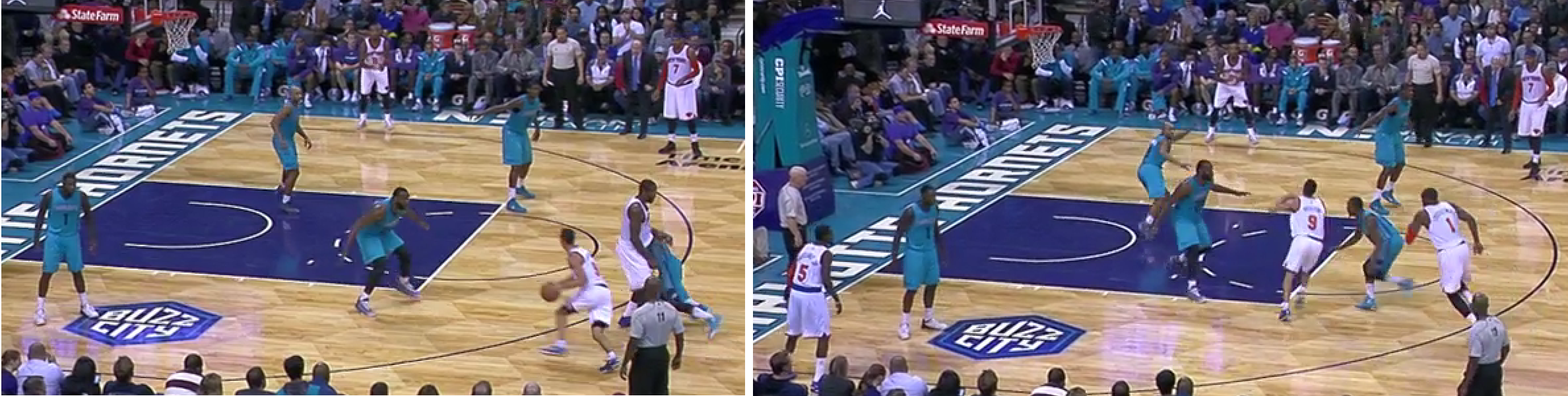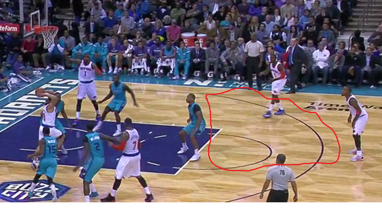 I would argue this is where the team started to tighten up. Kemba dribbles up the court, turns down a Jefferson pick, and takes an extremely difficult floater with 4 defenders around him and 13 seconds on the shot clock. You have to find a good shot here. This one was little more than a prayer. The spacing isn’t great, but Kemba’s not really helping things by short circuiting the play so quickly. Up until this play and the foul right before it that cut the lead from 10 to 8, Charlotte was withstanding a run of 3’s and tough shots and keeping the Knicks at arm’s distance. With 2 free throws and a really difficult, contested mid-range jumper from Melo, it’s a 6 point game with 2:49 left and the Hornets have put themselves in a position they didn’t need to be.